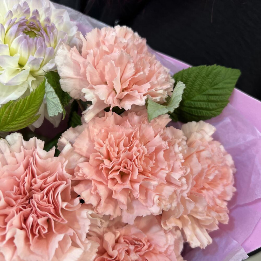 На фото букет из белых георгин и розовых гвоздик. В составе: георгина 3 шт, гвоздика 6 шт, зелень 2 шт, дизайнерская упаковка 1 шт, атласная лента 1 шт, . Все цветы свежие и ароматные, букет красиво оформлен и отлично подходит для подарка. Доступна доставка цветов или самовывоз.