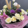 На фото букет из белых роз и сухоцвета. В составе: роза 7 шт, пампасная трава 1 шт, орхидея 1 шт, брасика 1 шт, эустома (лизиантус) 1 шт, хамелациум 1 шт, трахелиум 1 шт, крафт-бумага 1 шт, атласная лента 1 шт, . Все цветы свежие и ароматные, букет красиво оформлен и отлично подходит для подарка. Доступна доставка цветов или самовывоз.